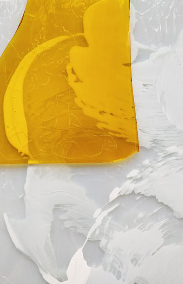 Techniek: 3 lagen beschilderd glas geven diepte aan dit werk. Stukken glas zijn erop verlijmd en een deel is gegraveerd.