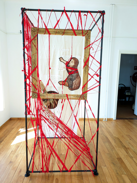 Technique: Stained and leaded glass, sewed and printed linen in a composition of different collected materials
